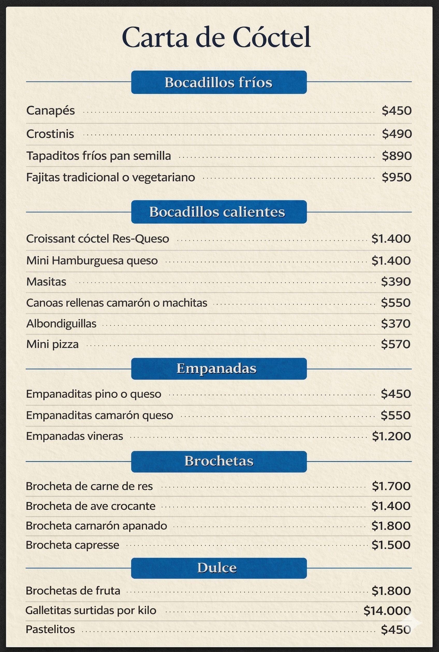 Nuestra tradición se basa en la calidad, el buen gusto y el servicio responsable. Nos especializamos en preparar y decorar opciones gastronómicas que equilibran sabor, presentación y precios accesibles, siempre con el objetivo de brindar a nuestros clientes el evento que siempre soñaron.